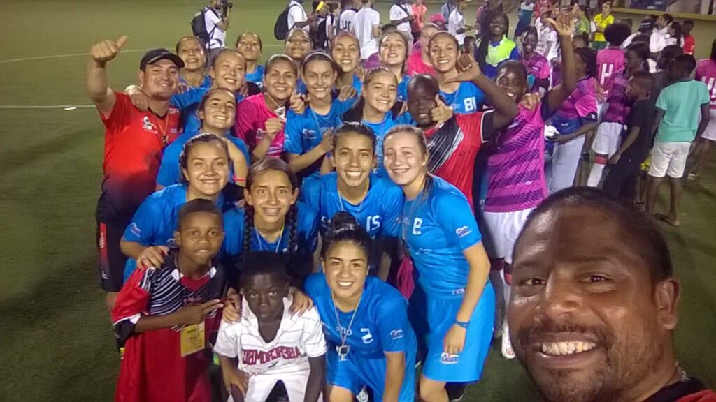 -Trabajé con la Universidad Distrital. Mis padres también son egresados de la universidad. Entonces, cuando me retiré, me fui un día a saludar a mi papá, y quien es el director del bienestar hoy en día, me dice que por qué no dirigía el equipo de fútbol de estudiantes. En mi mente no estaba ser entrenador ni nada de eso. Él me dijo que por mi experiencia, que podía transmitir lo aprendido a los muchachos, y que si no me gustaba, no habría ningún problema. Y resulté en una fase final. Tuve un padrino que me arropó en todo el proceso juvenil, y es Irmen Lozano, hoy en día está en Portugal, ex gran jugador de Millonarios, Santa Fe, Tolima y selección Colombia. Con el que abrimos un proyecto para beneficiar el deporte en el Chocó. En el dos mil doce se empezó a poner en ritmo, porque en el dos mil diez se inició la estructura, fueron dos años de trabajo bien elaborado. Ahí la base principal del fútbol femenino era la base de la Universidad Distrital, grupo que ya estaba trabajando. Ahí comenzó el proyecto. Y en ese tiempo enfrentamos lo que era Gol Star, City Fútbol, ese equipo que ya estaba, Marian Morales, Ivonne Chacón, Ángela Martínez. También en ese momento es claro que todavía no había fútbol profesional, entonces todas las jugadoras se iban para los Estados Unidos. Cuando era finales de la liga, llegaba Ariza, Micaela, Natalia Gaitán, también Viviana Acosta, Alison Ballesteros, Angie Castañeda. Cuando yo empiezo con el fútbol femenino, me encuentro con una camada muy dura, con un buen tiempo de formación. Ahí aparece el club de Banfield a los dos años, y de la Sergio Arboleda, equipos que ya se convertían en los primeros de las ligas y finales. Yo siempre he dicho que si para ese tiempo hubiese existido la liga profesional ¡uf! hubieran conocido jugadoras demasiado buenas e importantes, y muchas de ellas hubiesen podido llegar lejos como hoy en día, pero todo es un proceso, siempre se va a perder algo muy importante.